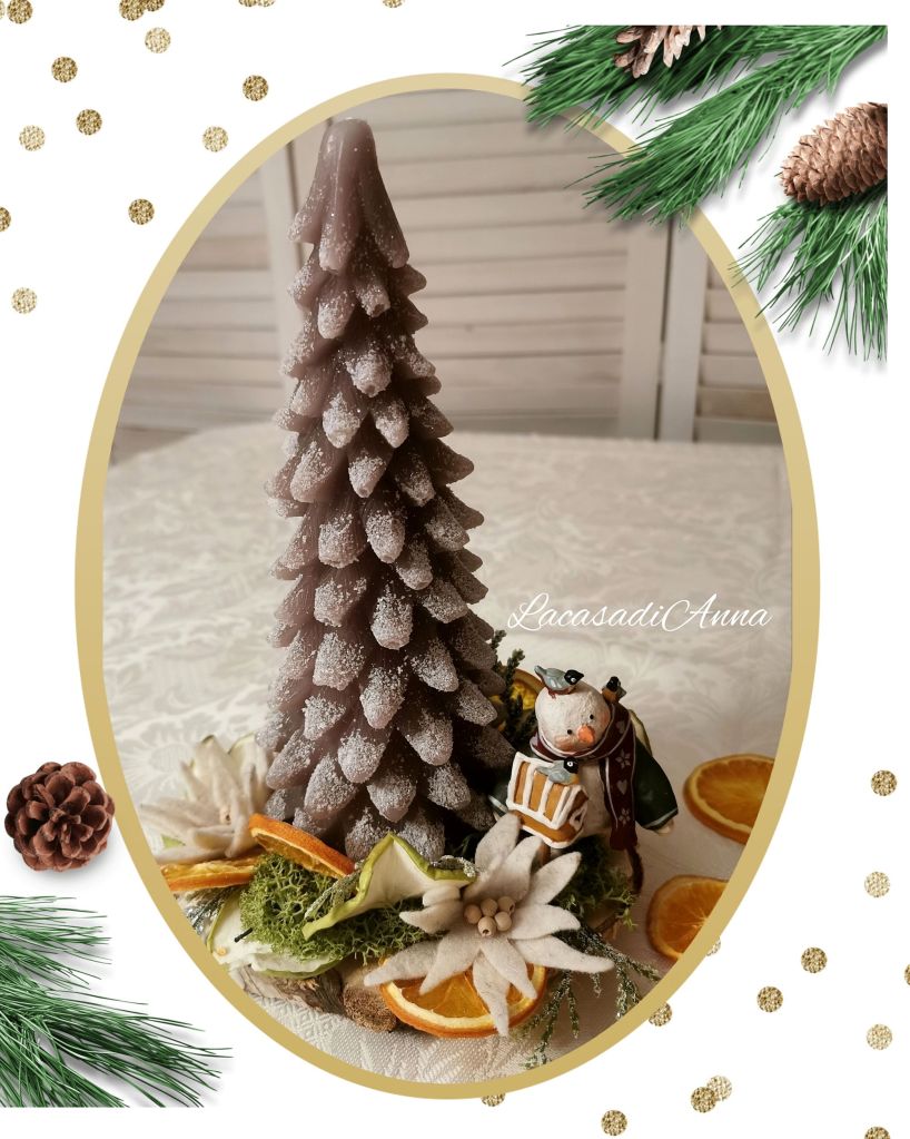 Poi deciderò se accendere la candela, magari a Capodanno, rendendolo ancora più luminoso contornato di cioccolatini dorati e frutta secca e altre fette di arancio. Per ora mi terrà compagnia così!