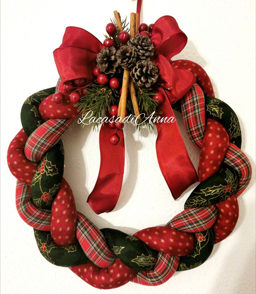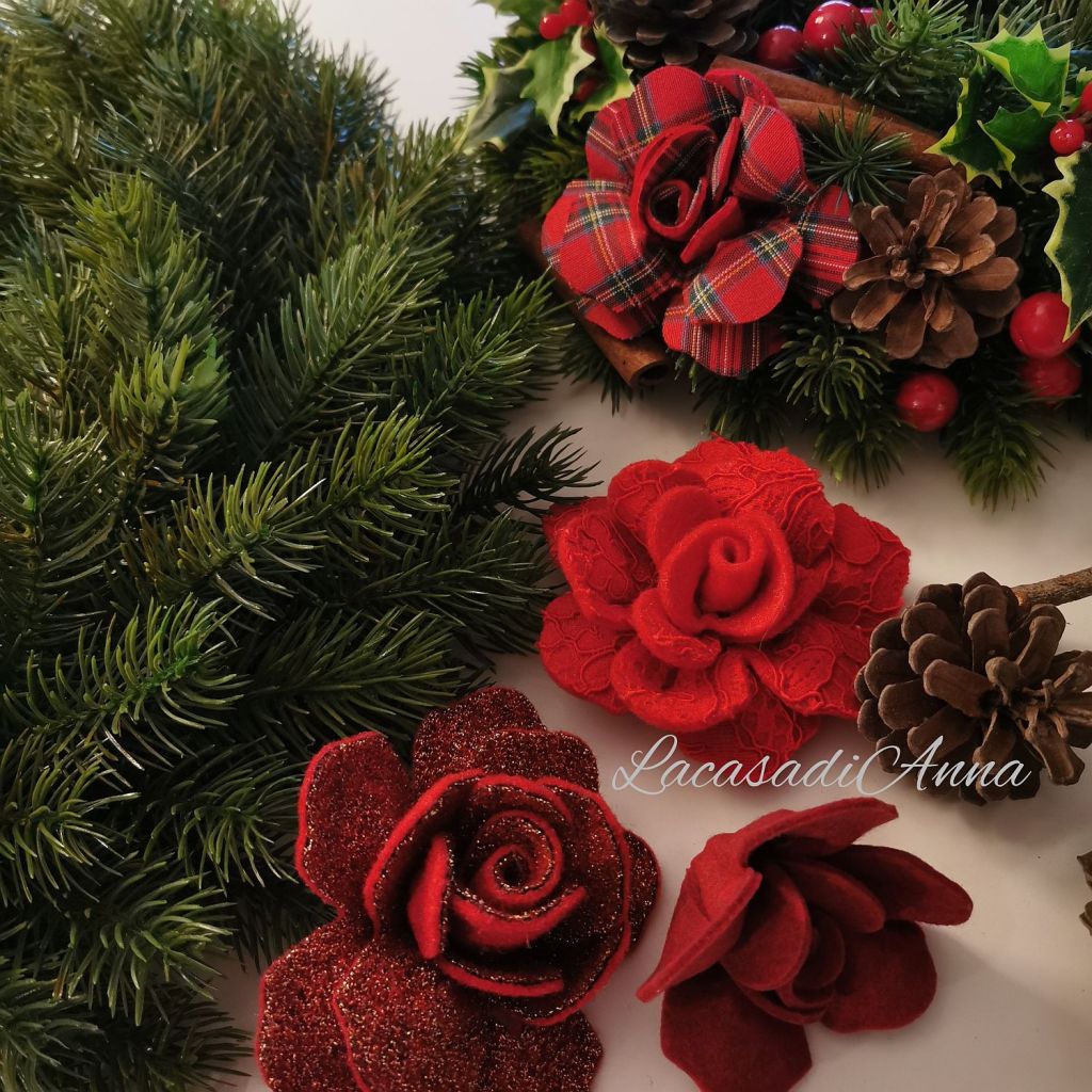 Fioriscono così rose rosse e rosa di panno lana con pizzo e senza, insieme a qualche fiore panna e a qualche rosa fatta con il tessuto tartan di cotone. Quel cestino lo poso frettolosamente accanto alle basi e tornando lì il giorno dopo “vedo” perfette le rose scozzesi sulla ghirlanda verde.