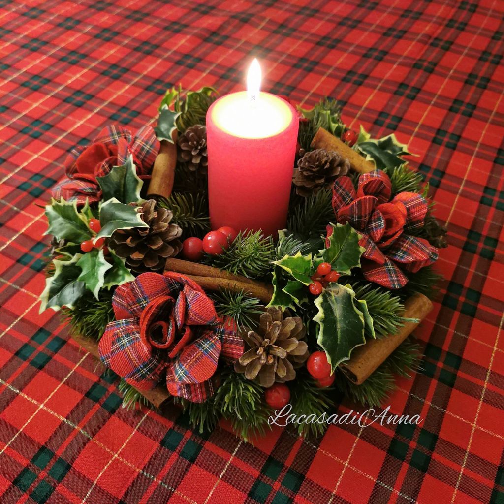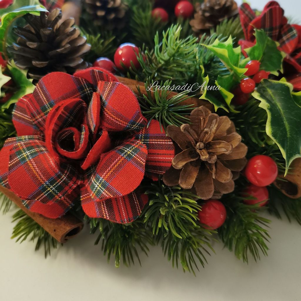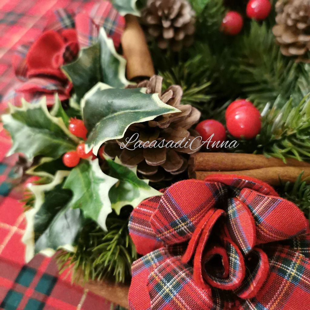 Cercando di tenere “naturale” la ghirlanda il più possibile ho inserito pigne e cannella e un pizzico di agrifoglio, nessun fiocco perchè le rose li sostituiscono benissimo! A tavola con una bella candela oppure sulla porta legata ad un fiocco. La mia ghirlanda country-chic è pronta!