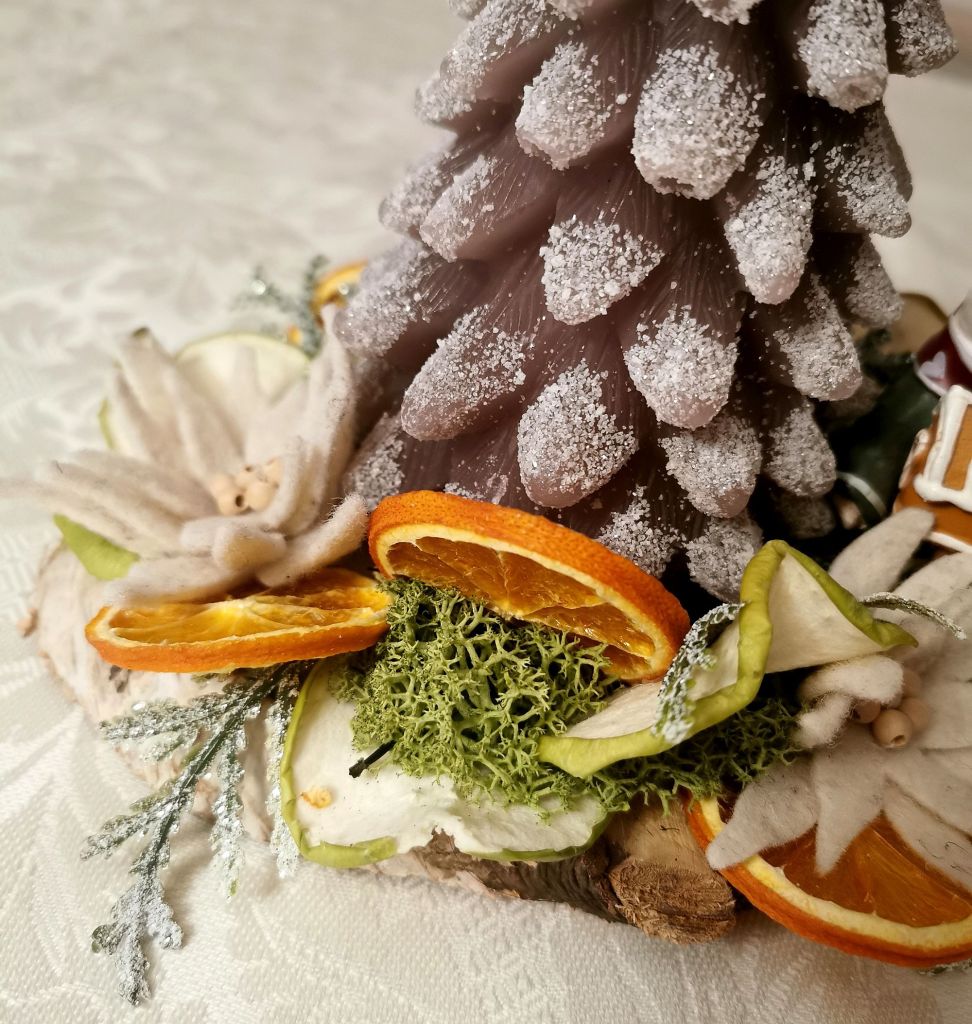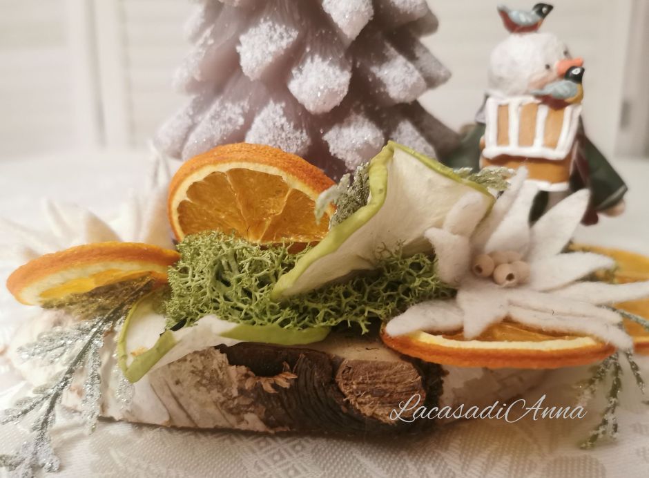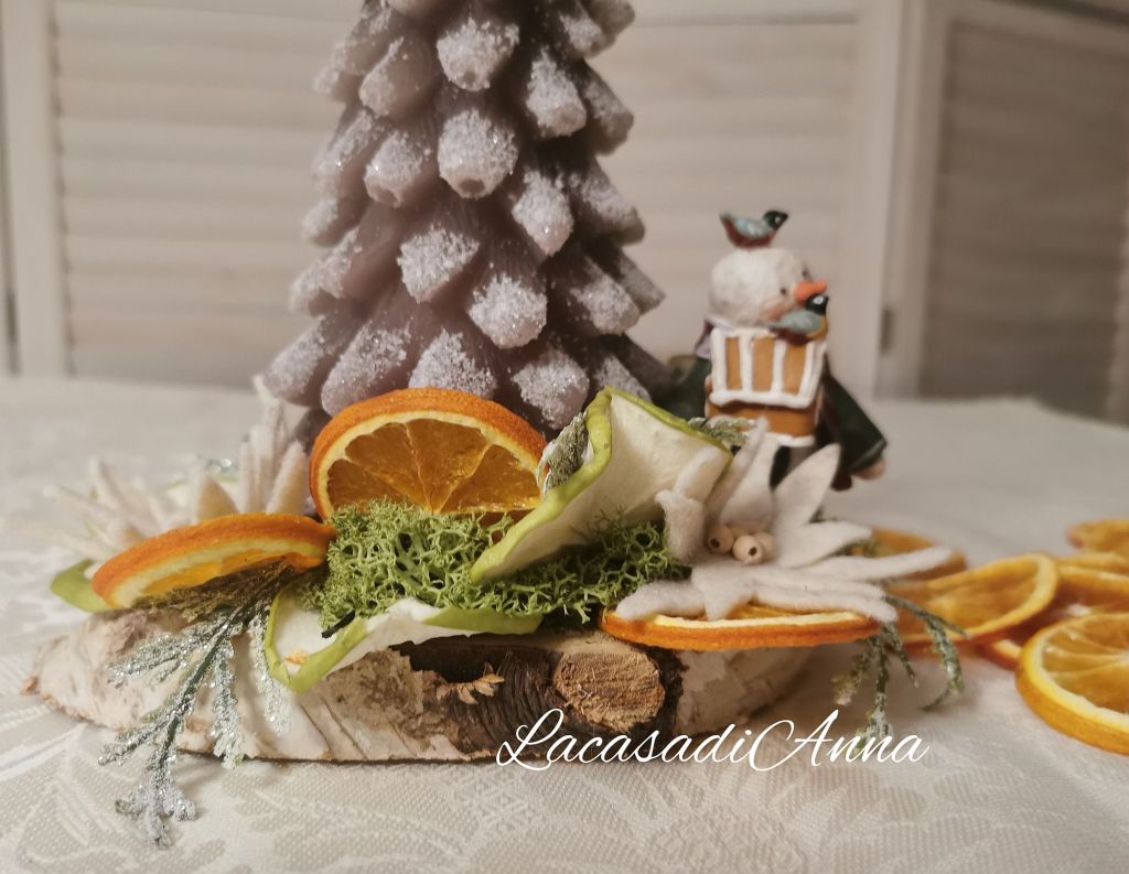 Nel mio caso ho usato fette di arancio e mela verde (il loro profumo mi infonde sempre allegria) incollate su una piccola base di legno. Tutto è nato da una candela delicata a forma di abete ghiacciato che mi ha fatto immaginare un piccolo e tenero ambiente invernale. Così ho preso il mio amato pupazzo di neve e l’ho poggiato di fianco dando poi spazio a stelle alpine fatte a mano e (senza esagerare) ad altre piccole decorazioni.