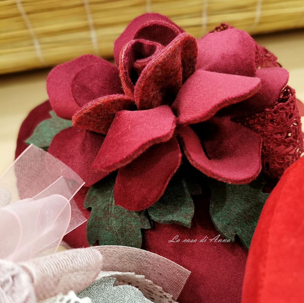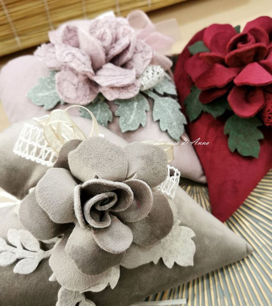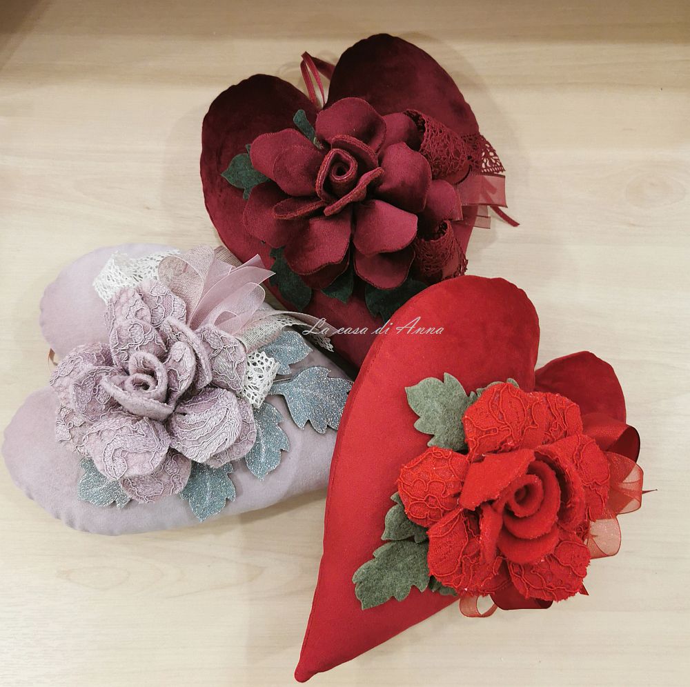 Chissà quante sfumature ha l’amore! E’ probabile che non le conoscerò mai tutte. Una cosa è certa non mi stanco mai di cucire cuori e questa volta tutti in velluto in più colori con le rose fatte quasi sempre dello stesso velluto o di panno lana con pizzo.
